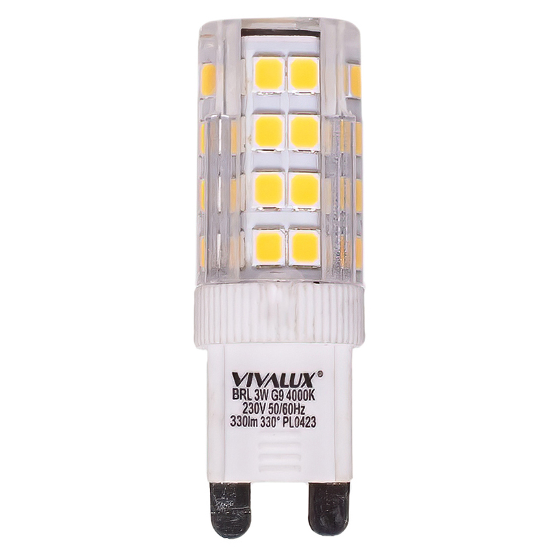 LED лампа 3W, G9, 230V, 4000K. BRILA LED G9 3W са предназначени да заменят халогенните G9 лампи с мощност до 35W. BRILA LED са с компактни размери и широк ъгъл на разпръскване на светлината – 330°.