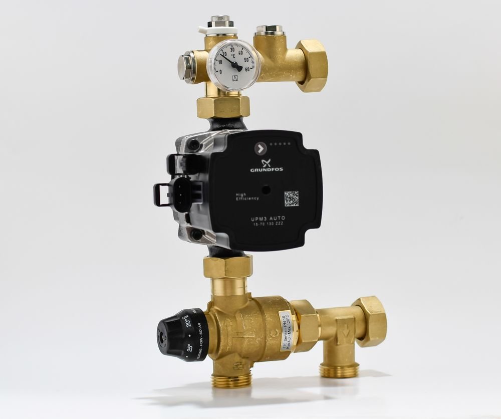 Смесителна група Grundfos за подово отопление от 20 до 50°C с трипътен термостатичен смесителен вентил от серията BRV 687 FIX.