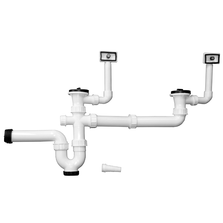 Сифон за двукоритна мивка с преливник и извод за перална или миялна машина