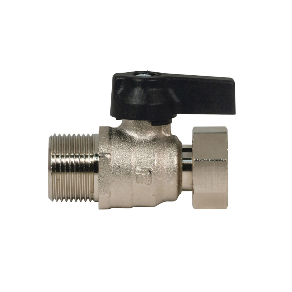 Кран SMALL Мъжки/женски за колектори с пластмасова синя или червена къса ръкохватка, с никелиран корпус, предназначен за бързо и многократно спиране на потока в системи с циркулация на горещи или студени неагресивни среди.