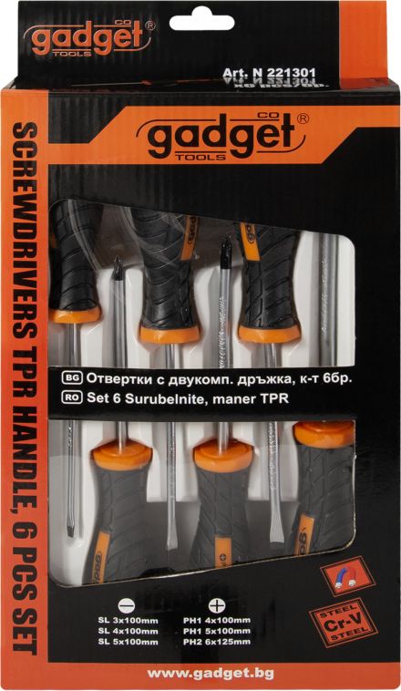 Отвертките на Gadget са изработени от висококачествена хром-ванадиева стомана за по-голяма здравина. Разполага с намагнетизиран връх и ергономична дръжка. Типът им е Slotted и Phillips и се предлагат по 6 броя в комплект.