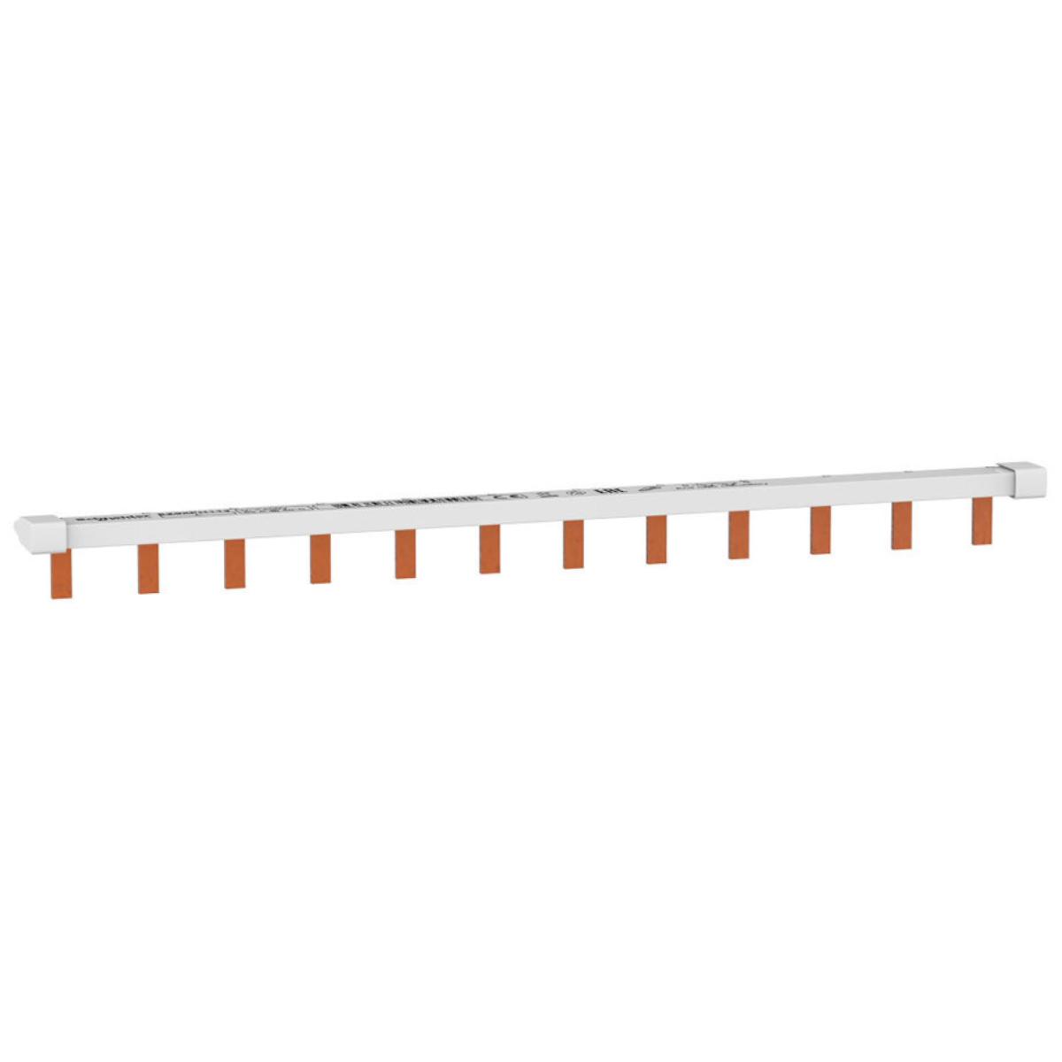 Гребенова шина за устройства от серия Schneider Electric серия Easy9, еднополюсна, 12 модула по 18 мм, номинален ток 63 A, тип конектор – PIN (пин), цвят – светло сив.