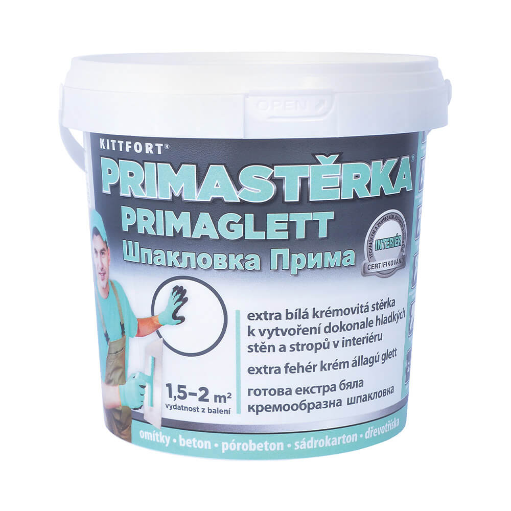 Шпакловка Kittfort Prima® е екстра бяла кремообразна шпакловка готова за нанасяне. Предназначена е за постигане на съвършено гладки стени и тавани в интериора. Може да бъде използвана за цялостно коригиране или за леки поправки. Подходящи основи са: бетон, гипсокартон, газобетон, шпакловки, обикновени силикатни повърхности, талашитени плоскости и други.